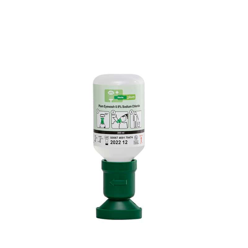 In addition to direct eye rinsing, the Plum eye wash bottle can also be used to refill the Plum eye wash station as well as to fill doctor's bags, first aid kits or first aid cases.